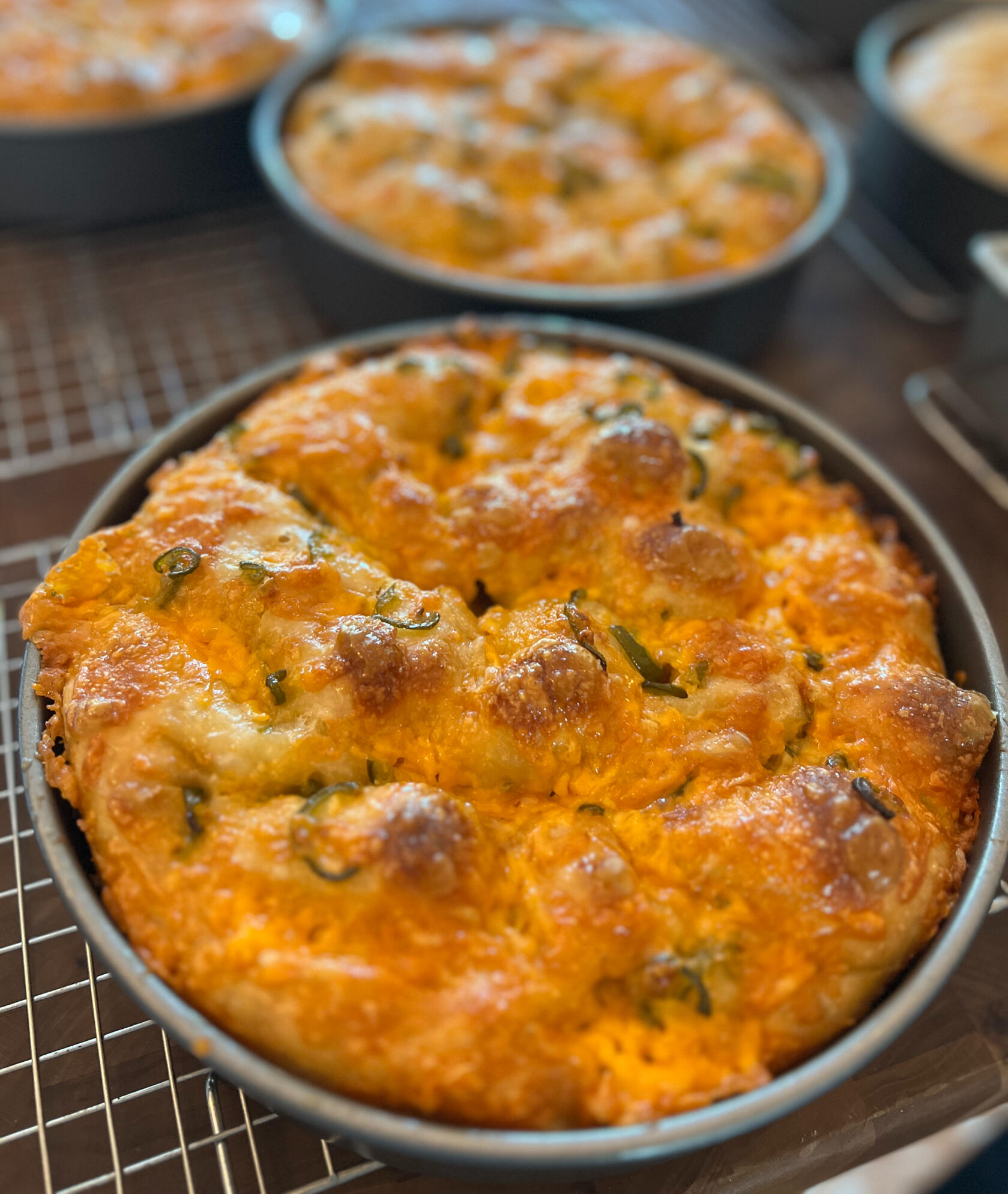 just before putting it in the oven, lightly spray a light mist of water over the top of the focaccia — this will help keep it moist!